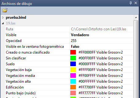 Podemos controlar la visualización de los archivos LIDAR cargados mediante el panel Archivos de dibujo. Si desplegamos el menú de opciones del archivo .las aparecen varias opciones que nos van a permitir activar/desactivar la visualización de un determinado archivo LIDAR tanto en la ventana fotogramétrica como en la ventana de dibujo, además de poder indicar el color con el que se visualizarán los puntos en función de la categoría en la que esté clasificado.