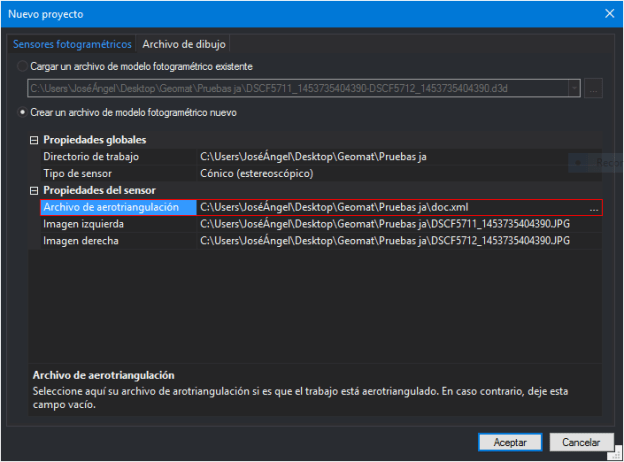 Tan solo tienes que indicar la ruta al archivo .xml en el campo Archivo de aerotriangulación en las propiedades del sensor Cónico (estereoscópico) al crear un modelo en el cuadro de diálogo Nuevo proyecto.
