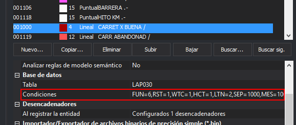 En el programa Editor de Tablas de códigos podemos añadir condiciones al campo Condiciones asociado con cada código. En estas condiciones básicamente podemos poner el nombre de un campo y un valor. Podemos poner tantas condiciones como queramos.
