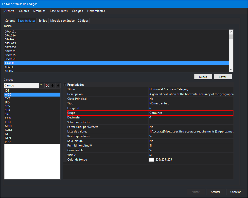 Digitab mostrando el campo Grupo en los atributos de un esquema de bbdd