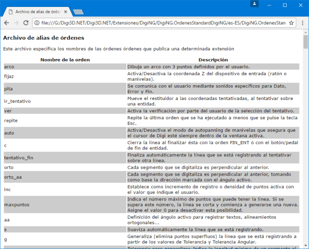 Pero los nombres de las órdenes dentro de cada uno de estos archivos .DLL no tiene nada que ver con los nombres de las órdenes que tiene que ejecutar el usuario. El nombre de las órdenes internamente es un GUID. La orden (en castellano) CIR2P por ejemplo en realidad se llama {C9CE4CF2-6029-48e7-9FC1-141708C22393}. De hecho puedes probarlo tú mismo, puedes ejecutar la orden {C9CE4CF2-6029-48e7-9FC1-141708C22393} y comprobarás que en realidad se está ejecutando la orden CIR2P, de manera que antes de preguntarle a cada una de la extensiones si implementan una determinada orden, debe transformar dicho nombre de orden al formato GUID, y para ello utiliza los archivos de alias, que no son más que unos archivos .XML ubicados en c:\Archivos de programa\digi21.net\Digi3D.NET\es-ES para español de España y en c:\Archivos de programa\digi21.net\Digi3D.NET\en-US para inglés americano.