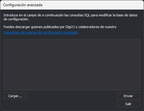 Esto abre el un cuadro de diálogo que permite introducir una sentencia SQL para modificar el archivo de configuración de Digi3D.NET que está ubicado en la ruta c:\ProgramData\Digi3D.NET\Digi3DNET.db. Este es un archivo SQLite.