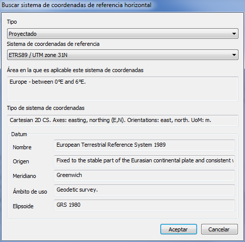 Si aceptamos el cuadro de diálogo, se modificará la cadena Well Known Text del cuadro de diálogo anterior. Si queremos memorizar el sistema de coordenadas siempre podemos pulsar el botón Memorizar, y si queremos eliminar algún sistema de coordenadas de la lista de sistemas de coordenadas memorizados, tan solo tendremos que seleccionarlo y pulsar el botón Eliminar.