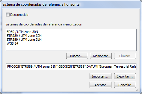 Este cuadro de diálogo nos permite por un lado indicar que el sistema de coordenadas es desconocido pulsando el cuadro de arriba del todo y por otro lado, si conocemos el sistema de coordenadas, nos permite seleccionar uno de la lista de sistemas de coordenadas memorizados.